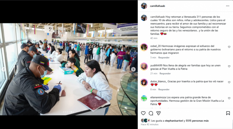 “Hoy retornan a Venezuela 311 personas, de las cuales 10 de ellos son niños, niñas y adolescentes”, así lo informó la presidenta de la Gran Misión Vuelta a la Patria, Camilla Fabri, a través de su cuenta en la red social Instagram.