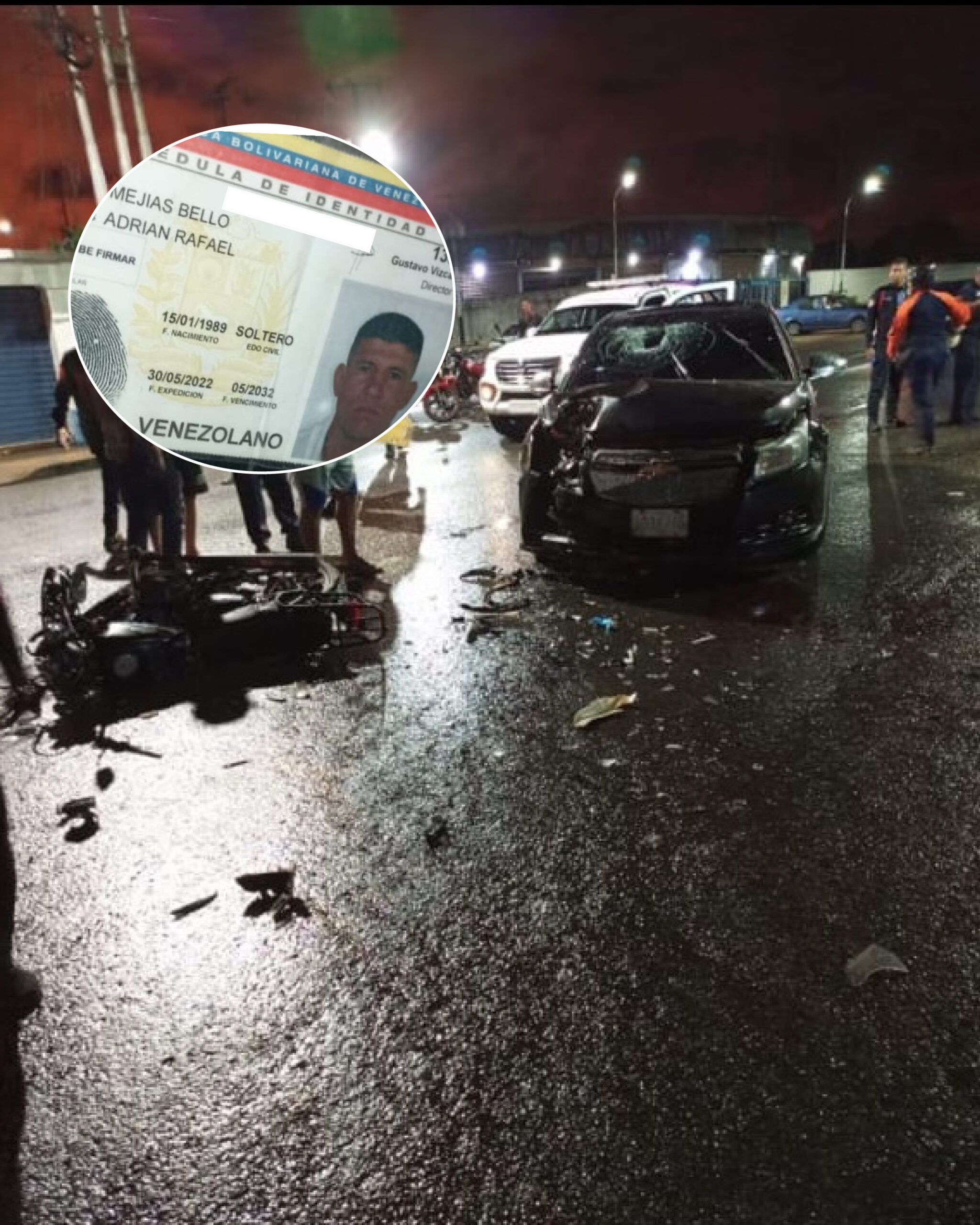 El herido fue identificado como Adrián Rafael Mejías Bello, de 37 años de edad. Según reportes preliminares y la documentación hallada en el sitio, Mejías se desplazaba en una motocicleta cuando colisionó contra un automóvil marca Chevrolet, modelo Cruze, color negro. El impacto fue de tal magnitud que el parabrisas del vehículo quedó totalmente destruido.