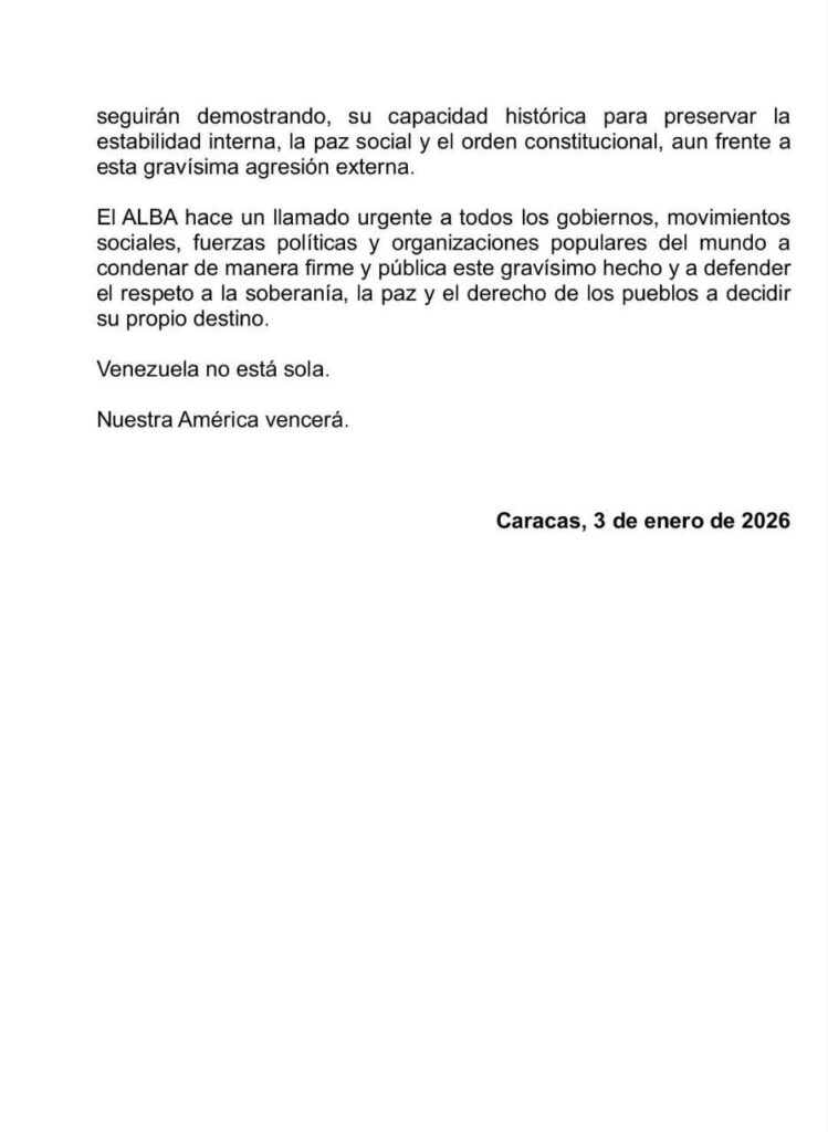 La Alianza Bolivariana para los Pueblos de Nuestra América – Tratado de Comercio de los Pueblos (ALBA-TCP) emitió este sábado 3 de enero un contundente comunicado oficial en el que condena de forma absoluta lo que calificó como un acto de guerra perpetrado por el Gobierno de los Estados Unidos contra la República Bolivariana de Venezuela.