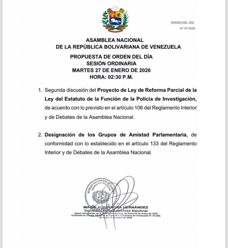 La Asamblea Nacional (AN) de la República Bolivariana de Venezuela, debatirá este martes 27 de enero, dos puntos importantes a partir de las 2:30 p.m.
