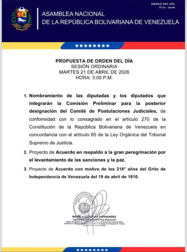 La Asamblea Nacional de Venezuela convocó a una sesión ordinaria a las 3:00 p. m. para este martes 21 de abril, con el objetivo de iniciar formalmente el proceso de renovación de las autoridades judiciales del país y conmemorar fechas de relevancia histórica y política.