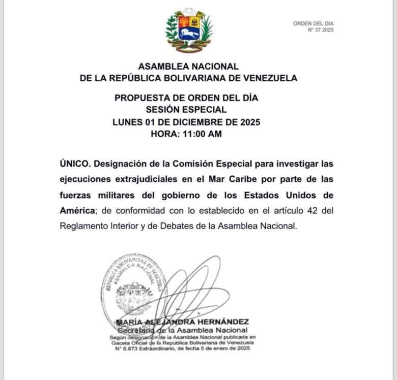 Este lunes, la Asamblea Nacional convocó una sesión especial en el marco de la designación de la Comisión Especial encargada de investigar las ejecuciones extrajudiciales en el Mar Caribe cometidas por fuerzas militares del Gobierno de Estados Unidos.