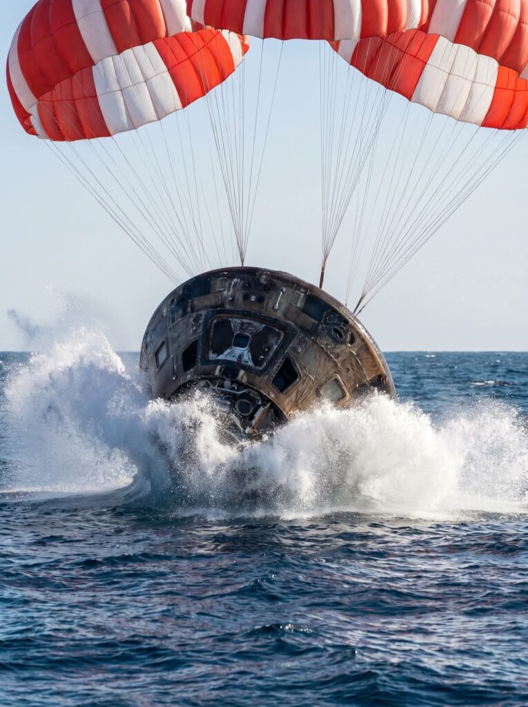 Tras recorrer un cuarto de millón de millas, la Orión reentró en la atmósfera terrestre a una velocidad máxima de 24,664 mph, soportando temperaturas extremas equivalentes a la mitad de la intensidad solar. El descenso fue frenado por un sistema de paracaídas gigantes que permitió un contacto suave con el océano.