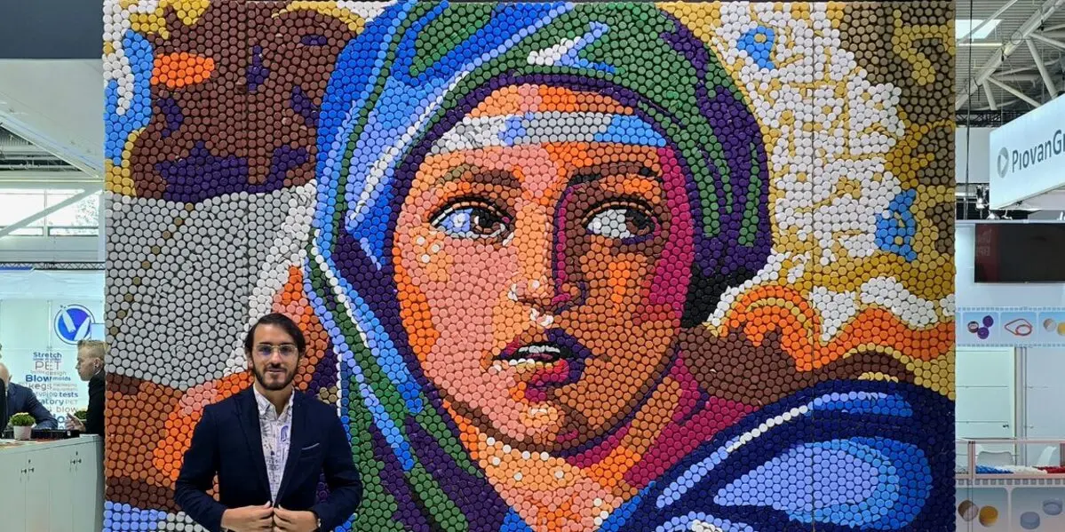 El mural, que se exhibe en la feria Drinktec, está inspirado en la figura de la Sibila Delphica de la Capilla Sixtina y marca un hito en la trayectoria de Olivares, conocido por su uso de material reciclado en sus creaciones.