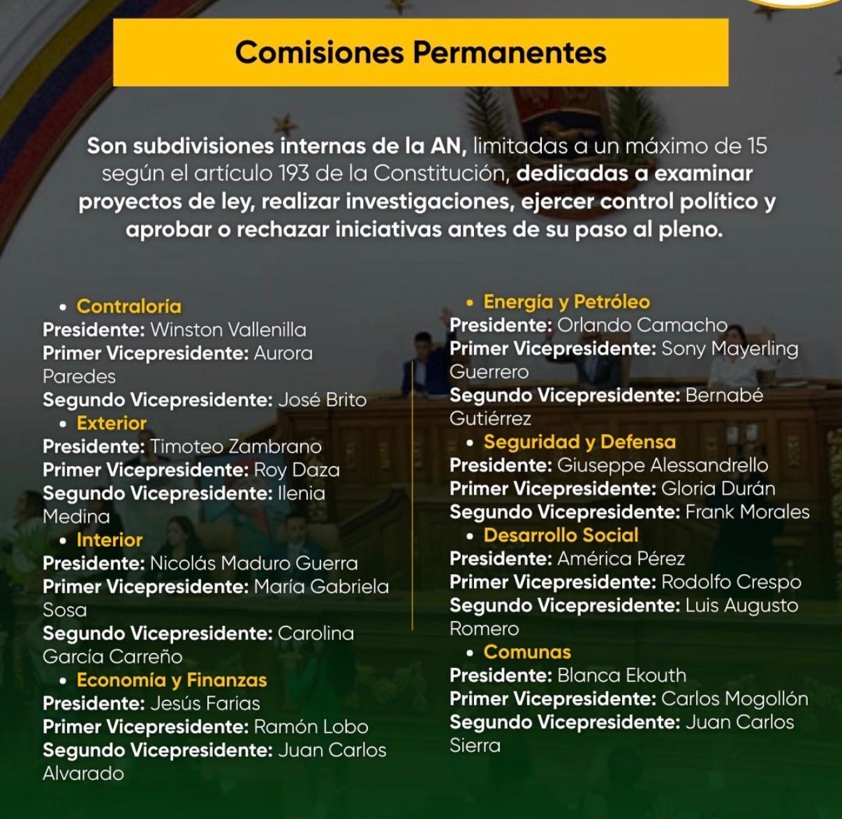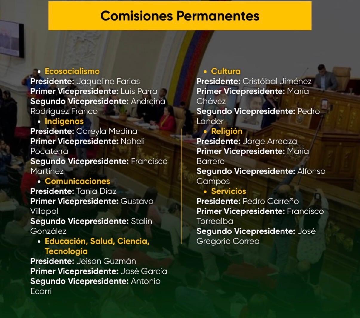En la sesión ordinaria de este martes, el presidente de la Asamblea Nacional (AN), Jorge Rodríguez, nombró las directivas de las 15 comisiones permanentes del Poder Legislativo.