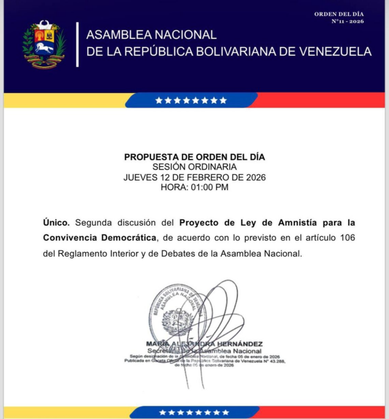 La Asamblea Nacional debatirá este jueves 12 de febrero de 2026, a la 1:00 de la tarde, la segunda discusión del Proyecto de Ley de Amnistía para la Convivencia Democrática.