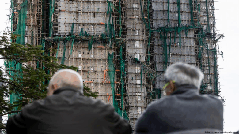 Los inmuebles se hallaban cubiertos por andamios de bambú revestidos con mallas de seguridad debido a trabajos integrales de renovación de todo el complejo.