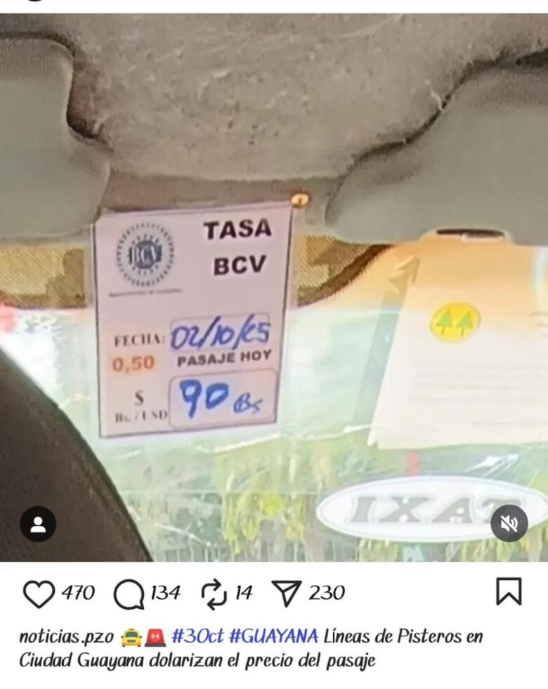 Por otro lado, en el estado Bolívar, de acuerdo con información de un medio de comunicación local, el pasaje lo habrían fijado en dólares. Señala que los montos anclados al dólar en las líneas de Pisteros en Ciudad Guayana quedarían en 0,5 dólares para Puerto Ordaz y en 1 dólar para San Félix.