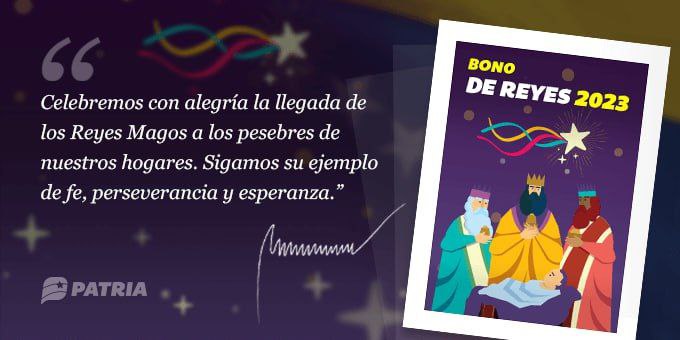 Inicia la entrega del Bono de Reyes 2023 enviado por el presidente Nicolas Maduro a través del Sistema del Carnet de la Patria.La entrega tendrá lugar entre los días 6 al 14 de enero de 2023 Su monto es de 72,00 bolívares lo que equivale a 3,9 dólares.