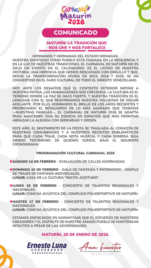 Durante la mañana de este 28 de enero, a través de un comunicado oficial publicado en sus redes sociales, la Gobernación de Monagas y la Alcaldía de Maturín anunciaron que ante los desafíos que el contexto exterior impone a Venezuela, el Carnaval de Maturín se adapta para mantener viva su esencia, sin embargo, en la planificación que publican no se encuentran los tradicionales desfiles en la Av. Raúl Leoni ni el reinado.