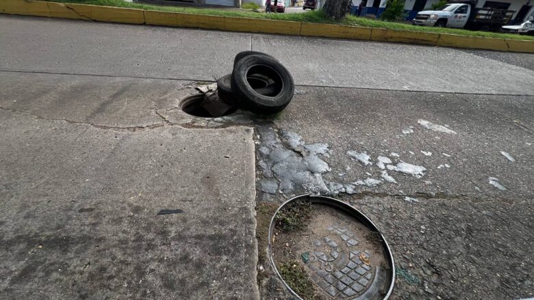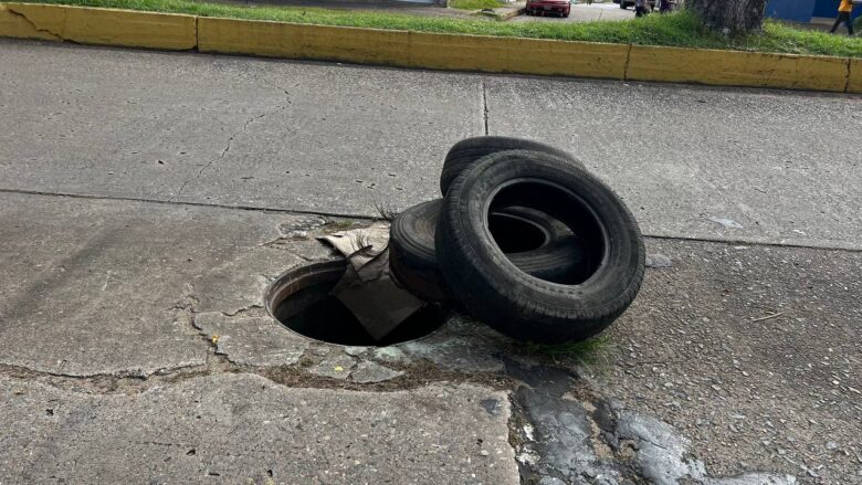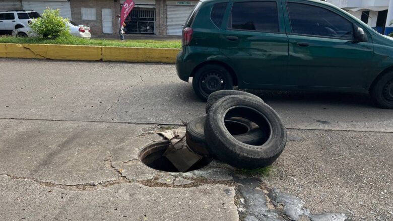 Por su parte, Richard Lara, chofer de la zona, indica que «como señal de alerta, colocaron varios cauchos, imagino que los vecinos o comerciantes para que los conductores los vean de lejos y logren esquivar el hueco».