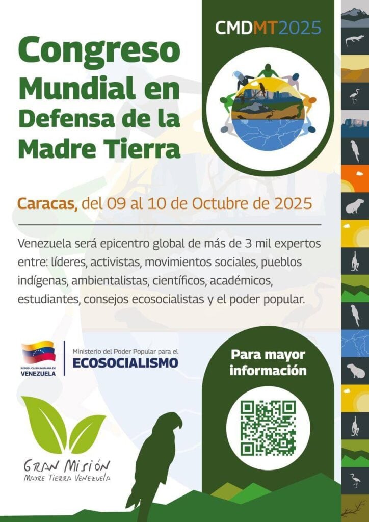 Más de 3 mil delegados nacionales e internacionales de 56 países abordarán la crisis climática y el modelo socioeconómico imperante como temas centrales en el ámbito de la discusión popular, durante el Congreso Mundial en Defensa de la Madre Tierra, que se realizará en Caracas, Venezuela, del 09 al 10 de octubre de 2025.