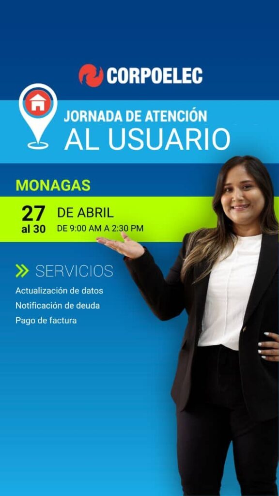 Desde este lunes 27 hasta el jueves 30 de abril, la Corporación Eléctrica Nacional (CORPOELEC) desplegará jornadas integrales de atención a usuarios residenciales y comerciales en la ciudad de Maturín, estado Monagas.