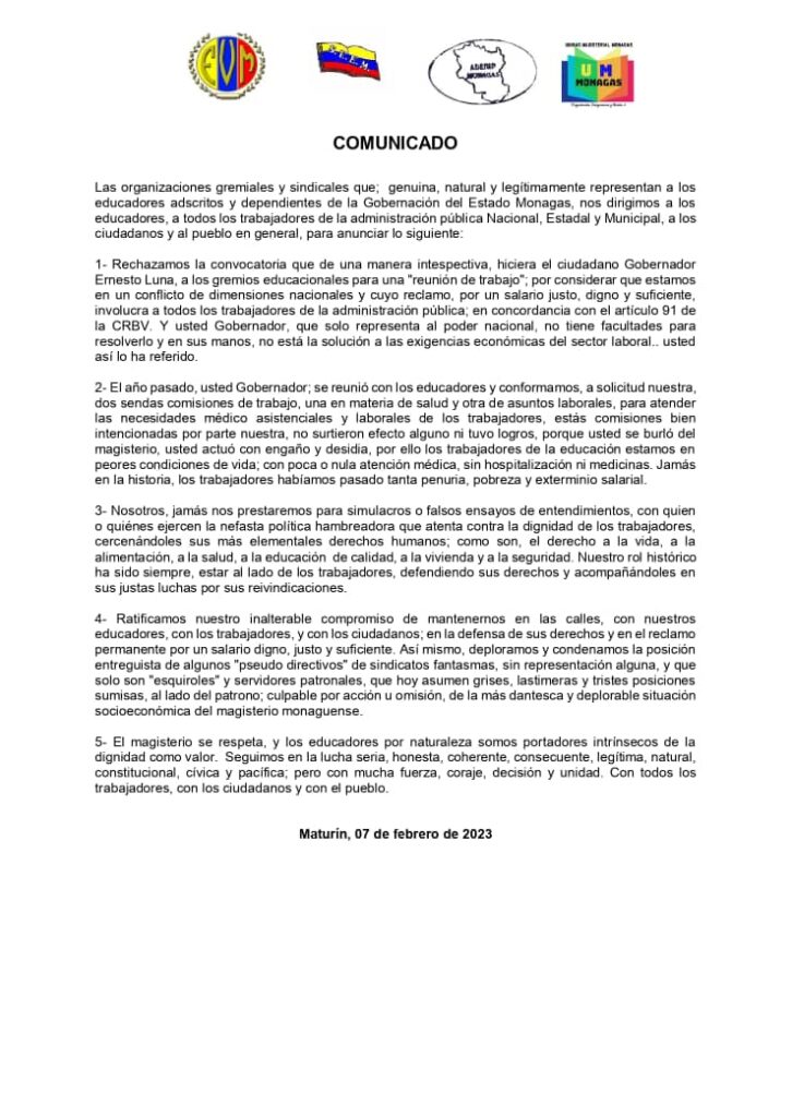 El presidente de la CTV Monagas sostiene que pese al encuentro del martes 7 de febrero, donde participaron autoridades de Educación y se acordó crear un Plan Quirúrgico para los docentes, esto no representa una solución porque «los docentes tienen una cláusula contractual. No es algo temporal ni esporádico, es algo sujeto al contrato colectivo y por eso el Estado está obligado a garantizar los servicios de HCM».