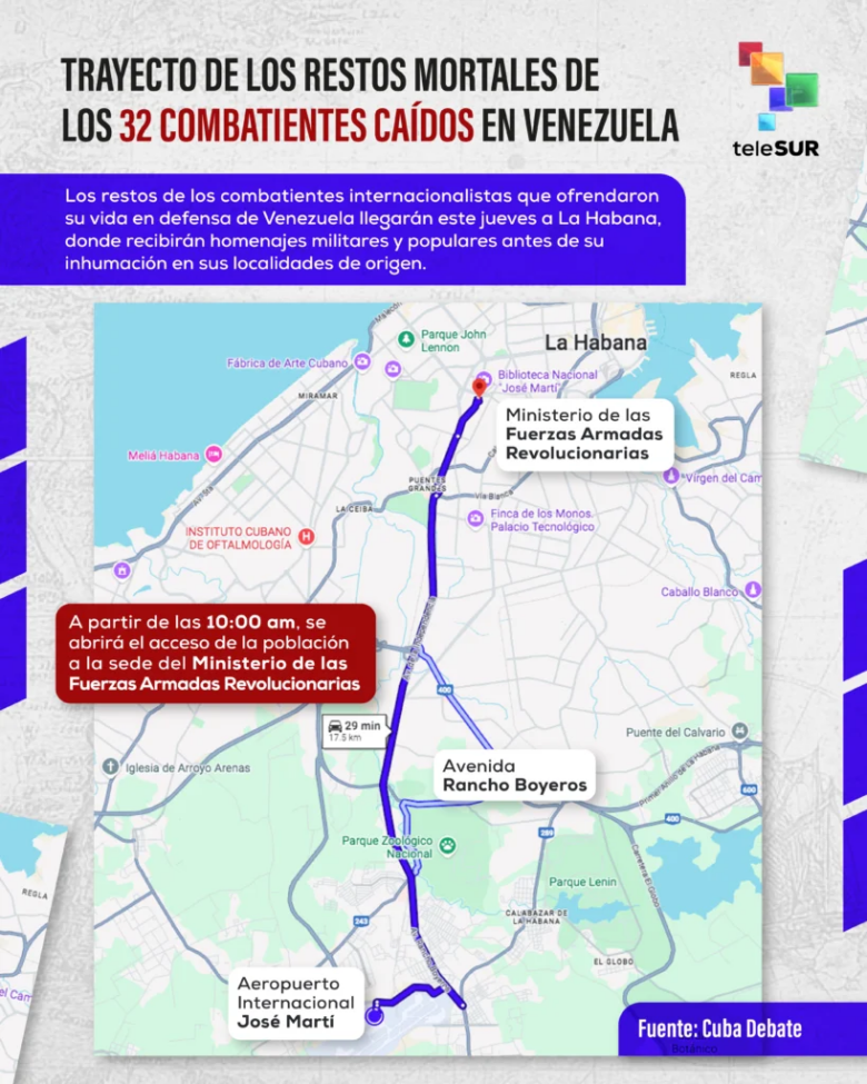 El masivo homenaje popular de los cubanos a estos héroes deviene muestra de solidaridad con el pueblo venezolano y contundente expresión de rechazo a las incursiones militares y la prepotencia de EE.UU. Con su valentía, los caídos demostraron su lealtad a las ideas de los Comandantes Hugo Chávez y Fidel Castro Ruz y defendieron la paz, la soberanía y la dignidad no solo de Venezuela y Cuba, sino también de nuestra América.