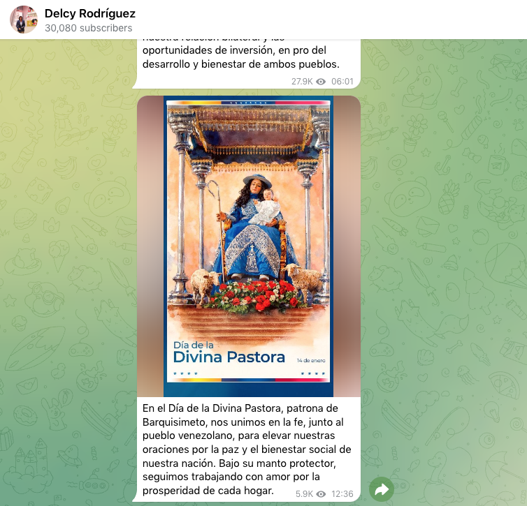 «En el Día de la Divina Pastora, patrona de Barquisimeto, nos unimos en la fe, junto al pueblo venezolano, para elevar nuestras oraciones por la paz y el bienestar social de nuestra nación», expresó Rodríguez.