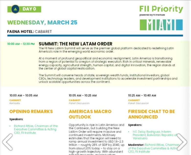 La presidenta encargada de Venezuela, Delcy Rodríguez, destaca en la agenda oficial de la FII Priority Summit 2026, que inicia este miércoles 25 de marzo en Miami Beach. Su participación se centrará en el panel «The New LATAM Order», un bloque clave dentro del foro organizado por el FII Institute.