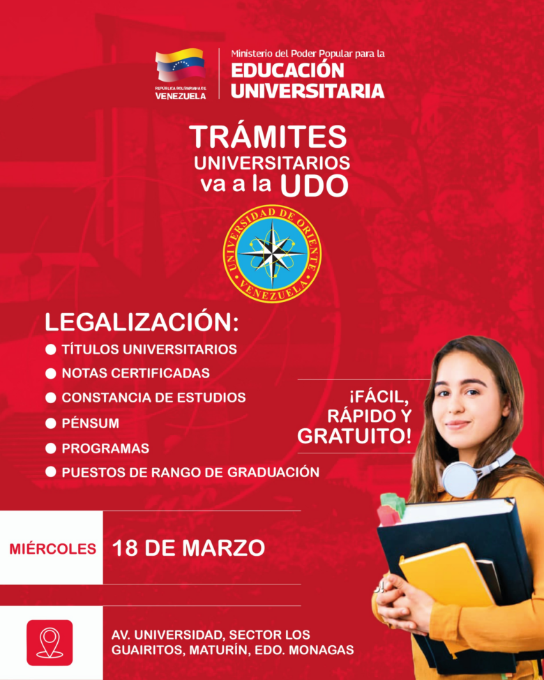 Con el firme propósito de facilitar el acceso de la comunidad académica a los procesos administrativos, la Oficina de Gestión de Trámites Universitarios (GTU) llevará a cabo una Jornada de Despliegue Territorial este miércoles 18 de marzo en las instalaciones de la Universidad de Oriente (UDO Guaritos), Monagas.