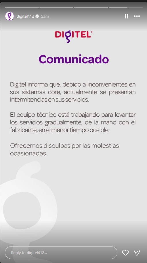 Tras las fallas que se registran este miércoles, la empresa de telecomunicaciones, Digitel, se ha pronunciado al respecto, reconociendo que presentan intermitencias en sus servicios.