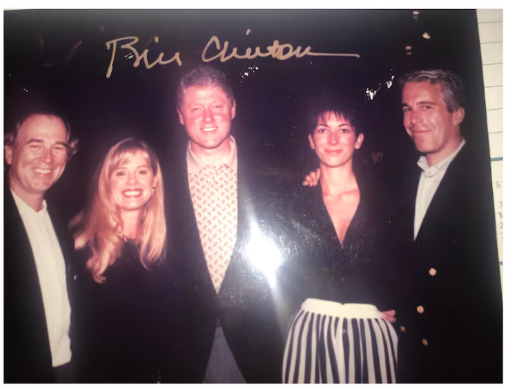 Otra imagen, con la firma de Bill Clinton en color dorado, muestra al expresidente demócrata sonriente y rodeado de Epstein, la conseguidora de este, Ghislaine Maxwell, y otra pareja. También se distingue en otra a Epstein y Bill Gates sentados ante una mesa y tomando lo que parece café o té, observados por una mujer de rostro oculto.
