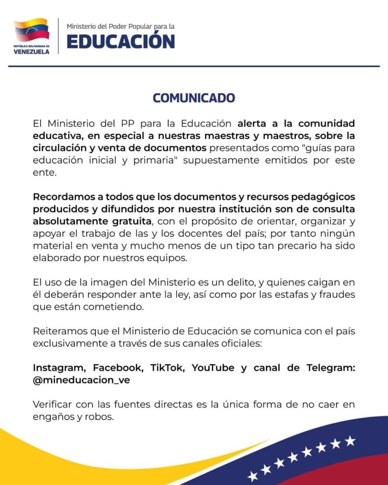 El Ministerio de Educación advirtió la noche de este viernes 10 de octubre, que las personas que estén vendiendo documentos o materiales presentados como “guías para educación inicial y primaria” supuestamente emitidos por el ente oficial enfrentarán la ley por delitos de fraude y estafa.