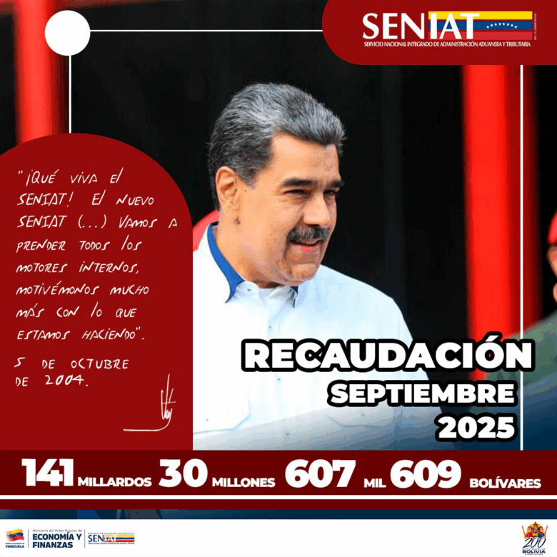 Cumpliendo las instrucciones del Presidente de la República Bolivariana de Venezuela, Nicolás Maduro Moros, y en acato a los lineamientos del Superintendente Nacional Aduanero y Tributario, José David Cabello Rondón, el Servicio Nacional Integrado de Administración Aduanera y Tributaria (SENIAT) cerró el mes de septiembre con una recaudación de 141 millardos 30 millones 607 mil 609 bolívares.