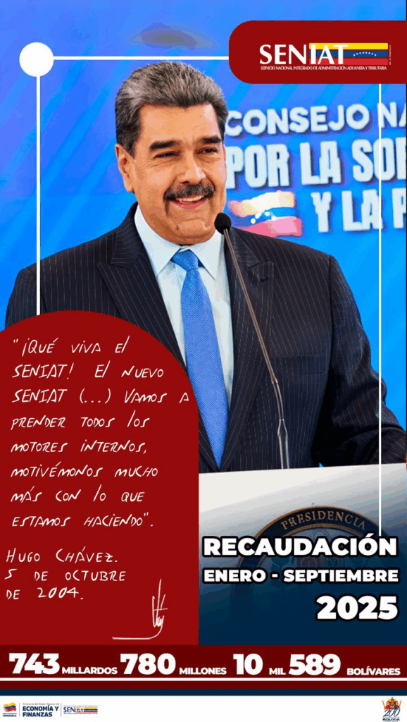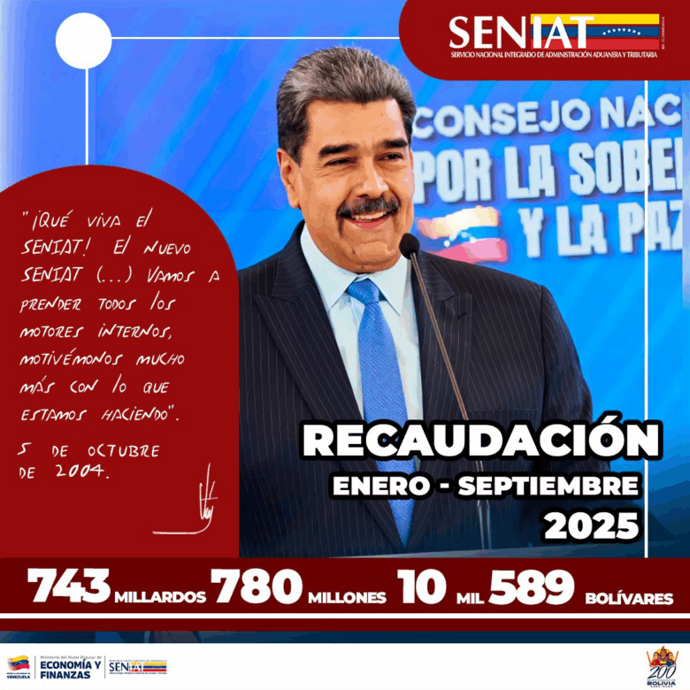 Es importante destacar que en el transcurso del 2025, el SENIAT ha recaudado un total de 743 millardos 780 millones 10 mil 589 bolívares, demostrando una vez más que estas cifras expresan la intención clara del Ejecutivo Nacional de seguir recaudando recursos para el bienestar social y económico del país, tal como lo contempla la primera transformación del Plan de las 7T.