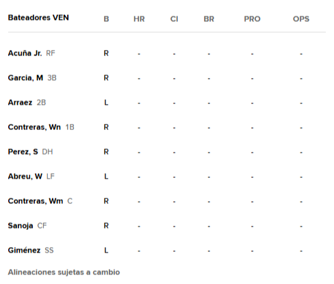 Como novedades, Omar López ha decidido decantarse por Ronald Acuña Jr., Maikel García y Luis Arráez, como sus primeros tres bateadores, siendo sorpresa la presencia de Arráez como el tercer bate del equipo, sin duda alguna.