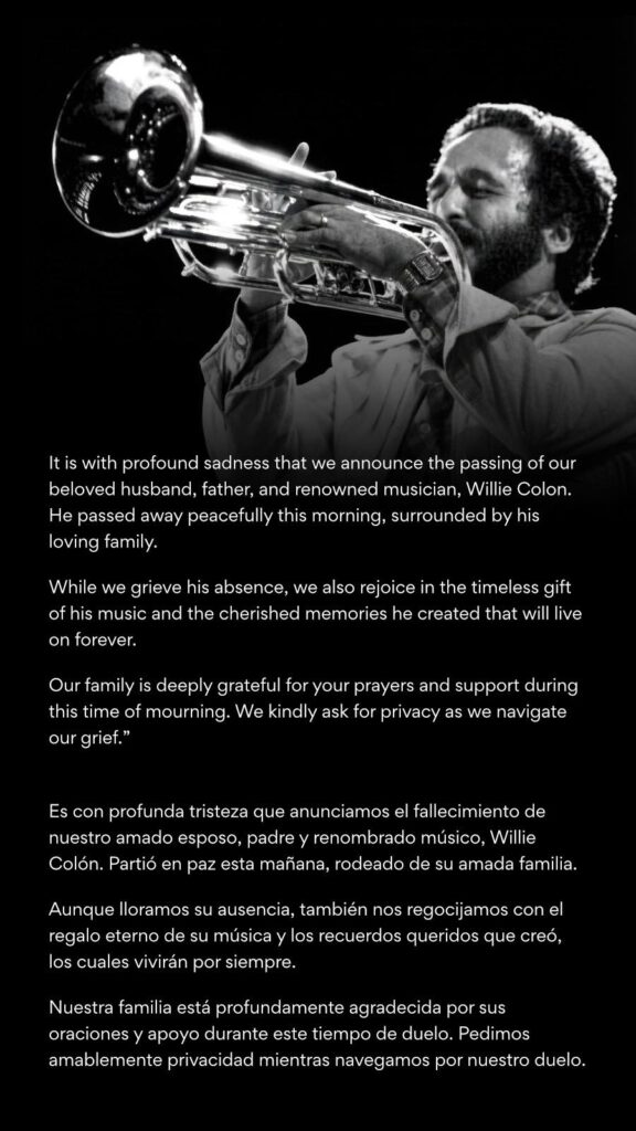 «Es con profunda tristeza que anunciamos el fallecimiento de nuestro amado esposo, padre y renombrado músico, Willie Colón. Partió en paz esta mañana rodeado de su amada familia», reza el comunicado.