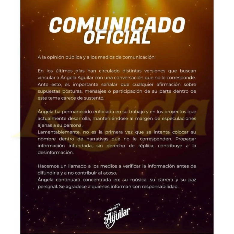 «En los últimos días han circulado distintas versiones que buscan vincular a Ángela Aguilar con una conversación que no le corresponde», se puede leer en el comunicado.