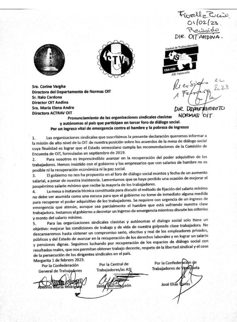 El Foro de Diálogo Social inició el Lunes pasado en la isla de Margarita con participación de delegados del gobierno del presidente Nicolás Maduro, encabezados por el ministro del Trabajo Francisco Torrealba, Fedecámaras y cuatro centrales sindicales que agrupan a trabajadores. La Organización Internacional del Trabajo (OIT) actúa como mediadora.