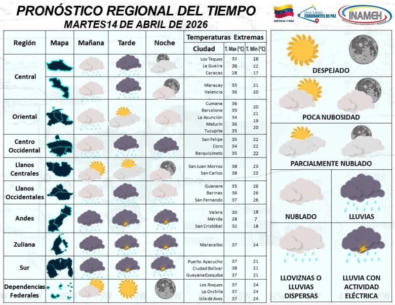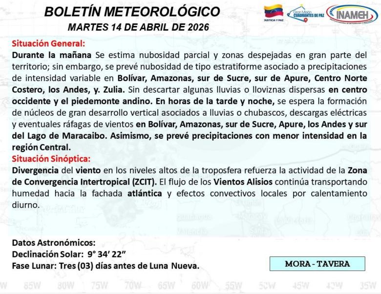Asimismo, se estima nubosidad convectiva asociada a lluvias o chubascos y descargas eléctricas en áreas del Zulia.