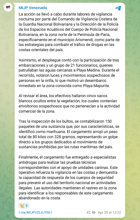 «La acción se llevó a cabo durante labores de vigilancia nocturna por parte del Comando de Vigilancia Costera de la GNB y la Dirección de la Policía de los Espacios Acuáticos de la CPNB, en la zona norte de la Península de Paria, como parte de las estrategias para combatir el tráfico de drogas en las costas orientales del país», informó el Ministerio de Relaciones Interiores, Justicia y Paz a través de sus canales oficiales.