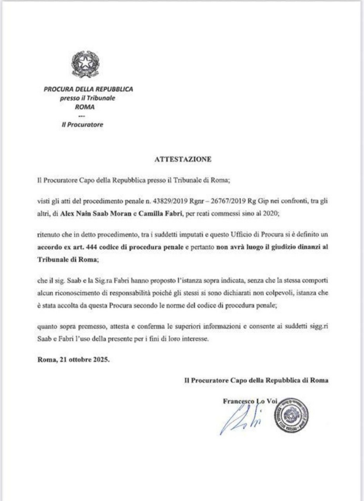 La información se dio a conocer tras un documento emitido por la Fiscalía de Roma, con fecha del 21 de octubre de 2025, que señala que en el proceso se llegó a un acuerdo entre Saab y Fabri y la instancia «de conformidad con el artículo 444 del Código de Procedimiento Penal y por tanto no se llevará a cabo el juicio ante el Tribunal de Roma».