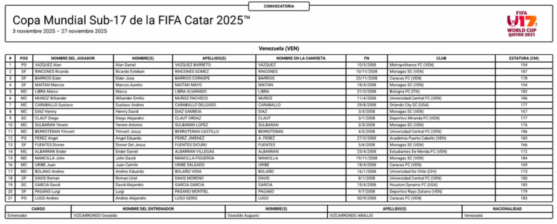 La lista de 21 convocados de cada una de las 48 selecciones fue publicada por la FIFA, incluyendo la del elenco dirigido por Oswaldo Vizcarrondo.