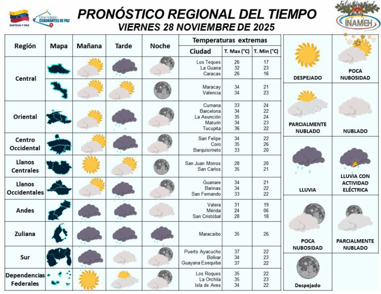 Durante la mañana, el Inameh señaló que en la mayor parte de Venezuela se espera nubosidad fragmentada alternando con zonas despejadas en buena parte del territorio nacional; sin embargo, advierte que pueden registrarse lluvias de intensidad variable que afectarán áreas al norte del Esequibo; Delta Amacuro, Amazonas, Lara, los Andes, Zulia, sur de Bolívar y oeste de Apure.