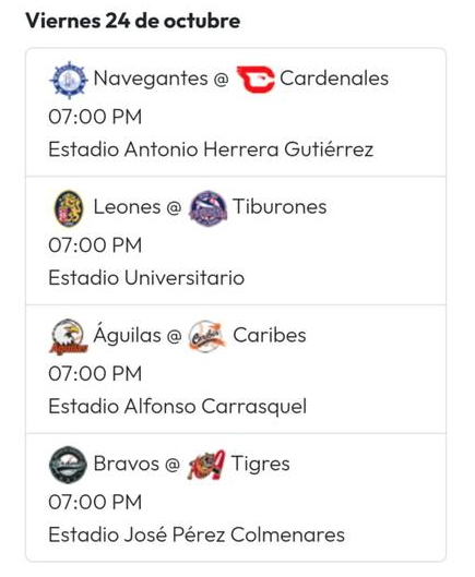 - En el Universitario: Leones del Caracas (Erick Leal) vs. Tiburones de La Guaira (por definir) 7:00 pm.