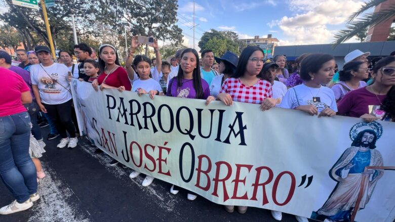 La escena capturada en las gráficas muestra una participación masiva que desbordó a largo de la avenida Bolívar. En la imagen se observa a un grupo de jóvenes cargando con solemnidad la pesada cruz de madera, escoltados por una multitud donde predominan los colores blanco y morado, símbolos de pureza y penitencia.