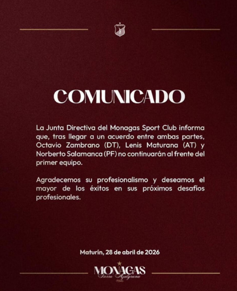 “La junta directiva del Monagas SC informa que, tras llegar a un acuerdo entre ambas partes, Octavio Zambrano (DT), Lenis Maturana (AT) y Norberto Salamanca (PF) no continuarán al frente del primer equipo”, dijo el club en un comunicado.