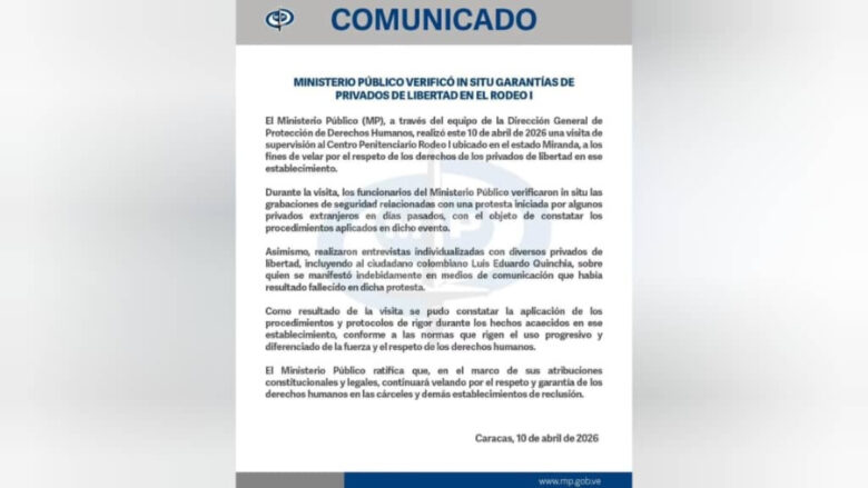 El Ministerio Público, a través de la Dirección General de Protección de Derechos Humanos, llevó a cabo una visita de supervisión en el Centro Penitenciario Rodeo I, ubicado en el estado Miranda. El objetivo de la inspección fue verificar el respeto a las garantías fundamentales y evaluar la situación tras los recientes incidentes reportados en el recinto.
