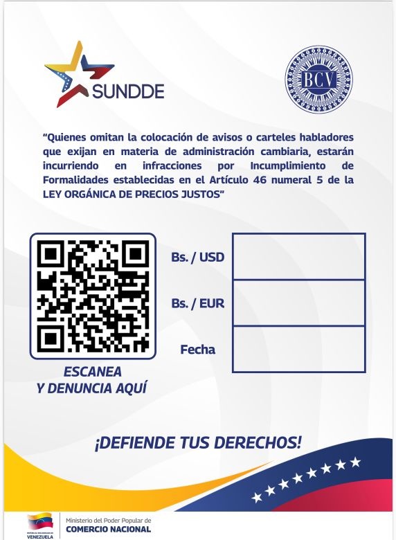 La Superintendencia Nacional para la Defensa de los Derechos Socioeconómicos (Sundde) anunció la implementación de un nuevo formato obligatorio para los comercios del país, con el que deberán informar la tasa de cambio oficial establecida por el Banco Central de Venezuela (BCV).