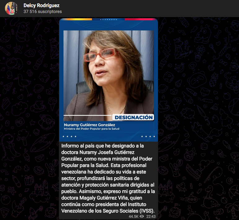 «Informo al país que he designado a la doctora Nuramy Josefa Gutiérrez González, como nueva ministra del Poder Popular para la Salud. Esta profesional venezolana ha dedicado su vida a este sector, profundizará las políticas de atención y protección sanitaria dirigidas al pueblo», escribió.