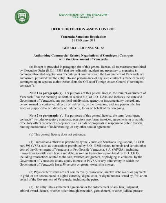 Licencia General No. 56: Autoriza la negociación y suscripción de contratos contingentes con el Gobierno de Venezuela. Esta licencia facilita que empresas y actores internacionales establezcan acuerdos comerciales cuya ejecución efectiva quede condicionada a futuras autorizaciones o cambios en el marco sancionatorio, permitiendo adelantar planificación operativa y legal.