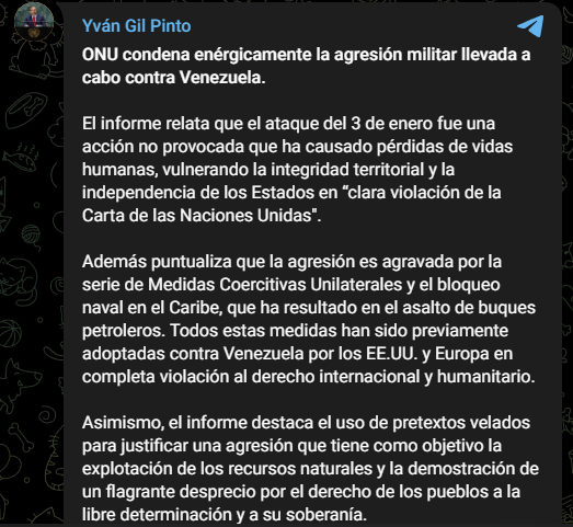 Este miércoles, el canciller de la República, Yván Gil, compartió un informe de la ONU donde el organismo condena firmemente el ataque militar de Estados Unidos contra Venezuela ocurrido el pasado sábado 3 de enero, que terminó en el secuestro del presidente Nicolás Maduro y la primera dama, Cilia Flores.