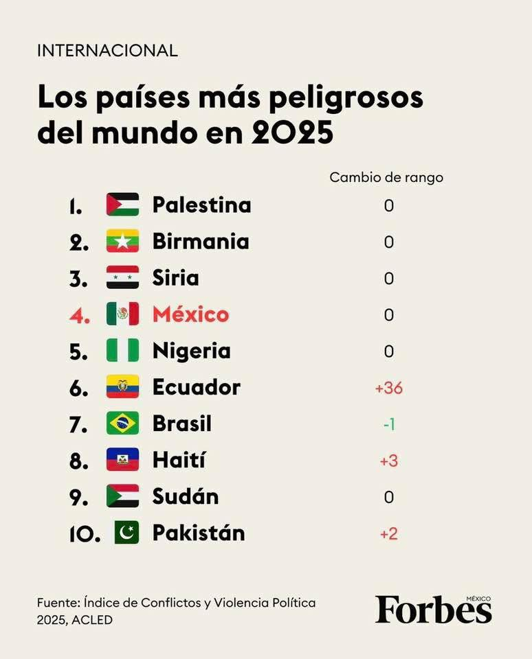 Otros países latinoamericanos incluidos en el índice son; Guatemala (17) y Chile (46), mientras que Bolivia (52) aparece en la categoría de violencia «baja o inactiva».