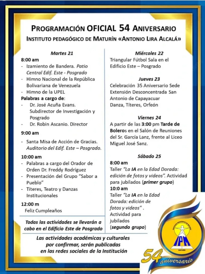 De igual forma, el decano manifestó que las festividades se extienden, debido a que el miércoles 22 continúan con actividades deportivas; el jueves 23 con celebraciones del 35 aniversario de la sede extensión San Antonio de Capayacuar; el viernes 24 con una tarde de boleros a las 3:00 de la tarde, frente al liceo José Miguel Sanz, y el sábado con un taller de “La IA en la Edad Dorada” y una actividad para los jubilados.