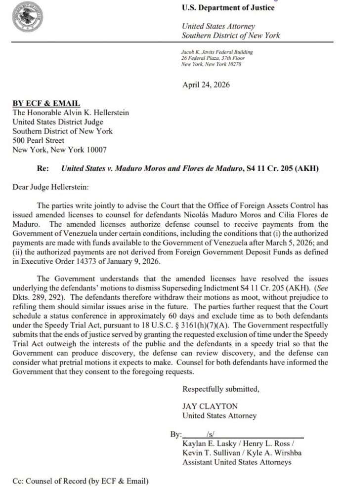 “Las partes notifican conjuntamente al tribunal que la Oficina de Control de Activos Extranjeros (OFAC) ha emitido licencias modificadas relativas a los servicios legales prestados a Nicolás Maduro y Cilia Flores. Dichas licencias modificadas permiten a los abogados defensores recibir pagos del gobierno venezolano bajo ciertas condiciones”, indica la carta dirigida al juez Alvin Hellerstein por el Departamento de Justicia.