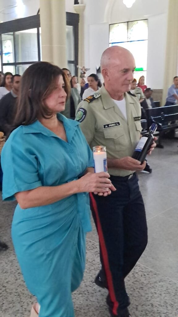 El director de Polimaturín, comisario general Antonio Pérez Luis, junto a su esposa, la dra. Rubdolly de Pérez, iniciaron con unas palabras, para luego dar paso al padre Miguel Febres, quien fue el encargado de auspiciar la misa.