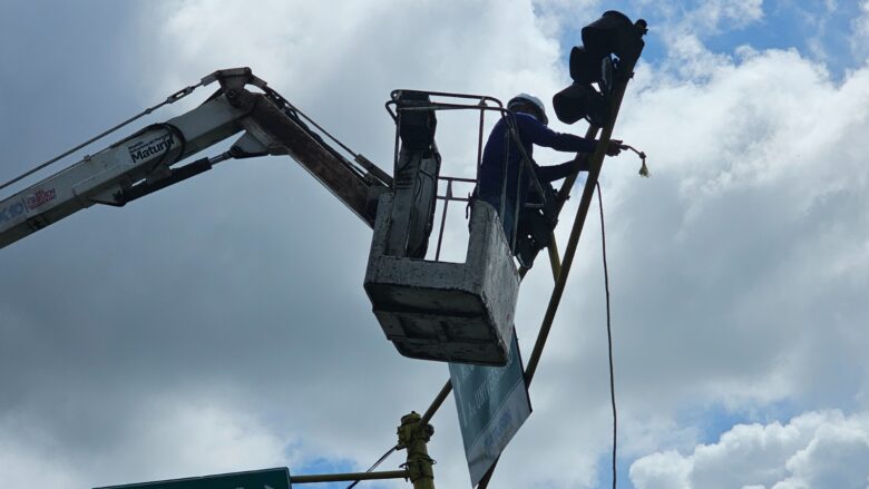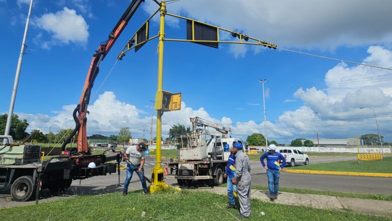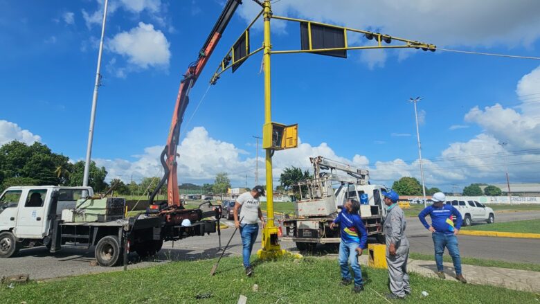 Este lunes 8 de diciembre, el equipo de la Dirección de Vialidad, cumpliendo orientaciones de la mandataria municipal, realizó el abordaje del semáforo ubicado en la avenida Libertador con la intersección de la a v. Orinoco, que fue embestido por un conductor imprudente, afectando la estructura y sus componentes electrónicos.