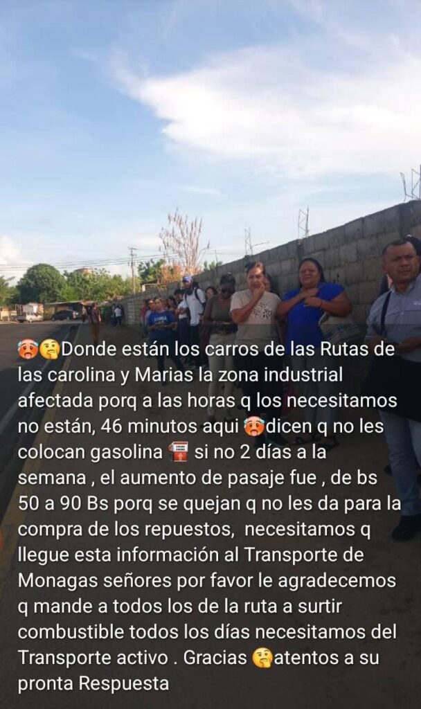«Los transportistas justifican esta acción alegando que la tarifa anterior no es suficiente para cubrir la compra de repuestos y el mantenimiento de las unidades. Ahora se supone que no tienen que poner excusas para seguir prestando el servicio. Hacemos un llamado a la Autoridad Única de Transporte de Monagas para que tomen cartas en el asunto y resuelvan esta situación», señalan.
